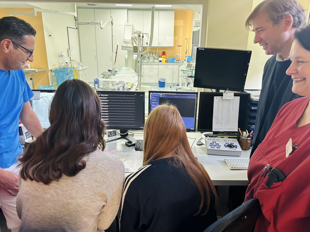 »Landrat Dr. Hermann Ulm besucht die Veranstaltung zum Tag der Gesundheitsberufe im Klinikum Forchheim - Fränkische Schweiz in Ebermannstadt, hier im Herzkathederlabor« (v. l. n. r. Chefarzt Dr. Samir Murad, Schülerinnen Emma und Lina, Landrat Dr. Hermann Ulm, Praxisanleiterin Melanie Dippold)
